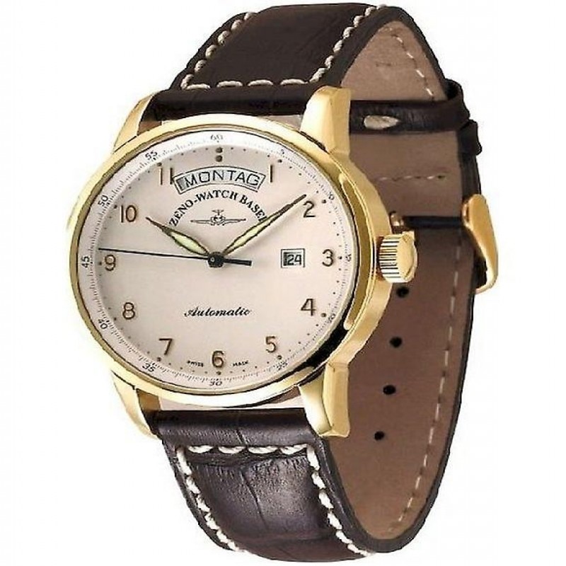 Marchio: Zeno Watch Basel Gruppo di prodotti: Orologi Gruppo target: Uomo Colore della cassa: Oro giallo Cristallo: Cristallo zaffiro Materiale del cinturino: Pelle ? Mm: 42 Materiale della cassa: Acciaio inossidabile Colore del quadrante: Bianco ? Altro: Fondello a vista Altro: Swiss Made Display: Analogico Colore del cinturino: Marrone Superficie del rivestimento: Lucido Forma della cassa: Rotondo Tipo di orologio: Orologi automatici Tipo di movimento: Automatico Tipo di chiusura: Fibbia ad ardiglione