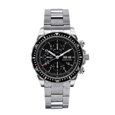 Orologio Marathon Jumbo Pilot/Diver Automatic Chronograph (CSAR) da 46 mm in acciaio inossidabile L'orologio Jumbo Pilot/Diver Automatic Chronograph (CSAR) da 46 mm è comunemente chiamato cronografo Search and Rescue (CSAR) ed è il più ambito della nostra categoria SAR. È considerato il "Santo Graal" dei nostri orologi ed è la scelta perfetta per chi esige il meglio in termini di qualità e prestazioni. Dotato di un movimento cronografico automatico a 25 rubini con precisione a 1/5 di secondo, la funzione cronometro utilizza la misurazione decimale a 1/100 di minuto per l'utilizzo nei registri di volo e nel monitoraggio del consumo di carburante. L'orologio può monitorare il tempo trascorso fino a 12 ore, rendendolo la scelta ideale per piloti e subacquei. Il movimento è alimentato da un ETA Valjoux 7750 con ammortizzatore Incabloc®, che garantisce una misurazione affidabile e precisa in ogni situazione. L'orologio è inoltre dotato di calendario con giorno e data. Per una facile lettura in condizioni di scarsa illuminazione, il CSAR è dotato di tubi al trizio e funzioni di illuminazione MaraGlo™. Il vetro è in zaffiro, resistente ai graffi e durevole, mentre la corona a vite garantisce l'impermeabilità fino a 30 ATM. Cassa e bracciale sono realizzati in acciaio inossidabile 316L e rifiniti con una texture spazzolata, che gli conferisce un aspetto elegante e moderno. La lunetta unidirezionale presenta una scala di 60 minuti e l'orologio ha una resistenza all'acqua di 30 ATM, rendendolo perfetto per le immersioni subacquee e altre attività acquatiche. L'orologio ha un diametro della cassa di 46 mm, uno spessore di 18 mm e una larghezza delle anse di 22 mm. Movimento: ETA Valjoux 7750 con Incabloc™. Ammortizzatore